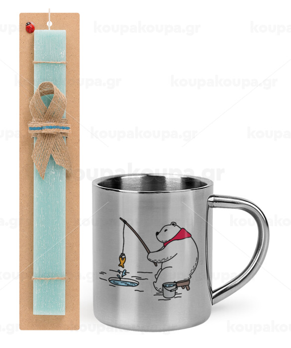 Αρκούδα ψαρεύει, Πασχαλινή Λαμπάδα με μεταλλική κούπα θερμό (300ml) & κερί αρωματικό πλακέ (30cm) (ΤΙΡΚΟΥΑΖ)