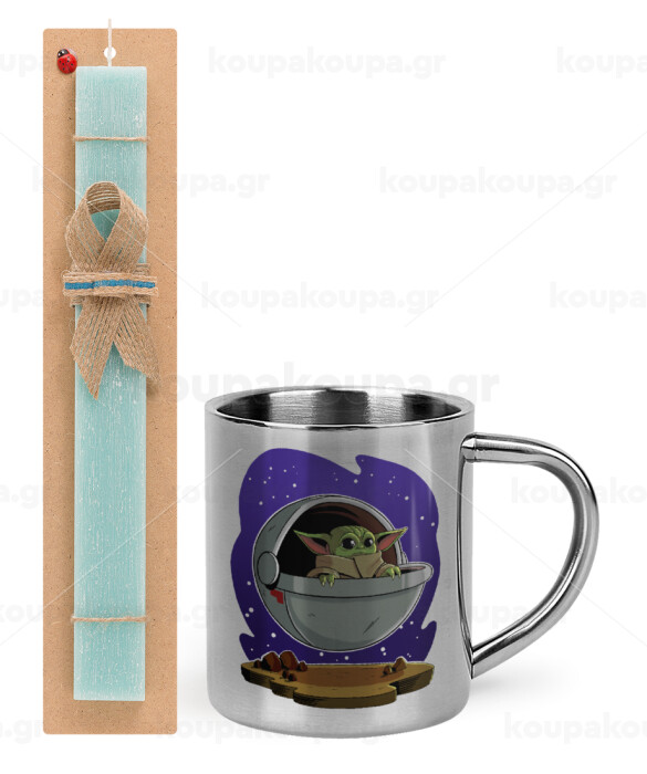 Baby Yoda mandalorian, Πασχαλινή Λαμπάδα με μεταλλική κούπα θερμό (300ml) & κερί αρωματικό πλακέ (30cm) (ΤΙΡΚΟΥΑΖ)