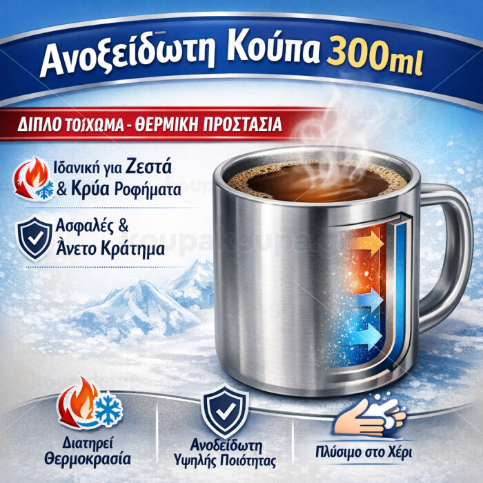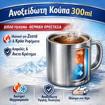 Κούπα ανοξείδωτη (300ml) με διπλό τοίχωμα εξαιρετικής ποιότητας. Κατάλληλη για ζεστά και κρύα ροφήματα. Προτεινόμενο πλύσιμο στο χέρι. Το διπλό τοίχωμα κρατάει την θερμοκρασία του ροφήματος εσωτερικά και επιτρέπει να αγκαλιάζετε το ρόφημα σας.