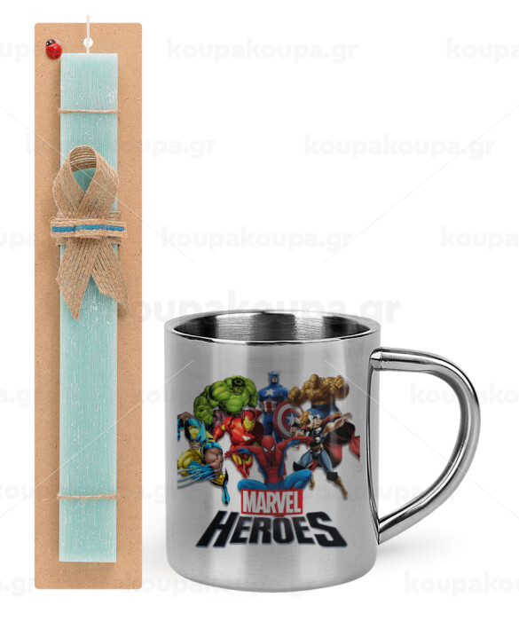MARVEL heroes, Πασχαλινή Λαμπάδα με μεταλλική κούπα θερμό (300ml) & κερί αρωματικό πλακέ (30cm) (ΤΙΡΚΟΥΑΖ)