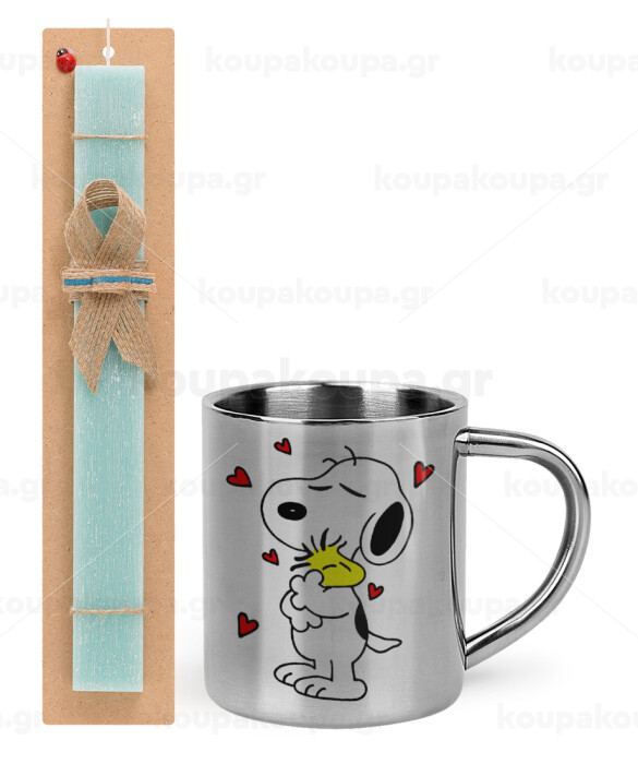 Snoopy Love, Πασχαλινή Λαμπάδα με μεταλλική κούπα θερμό (300ml) & κερί αρωματικό πλακέ (30cm) (ΤΙΡΚΟΥΑΖ)