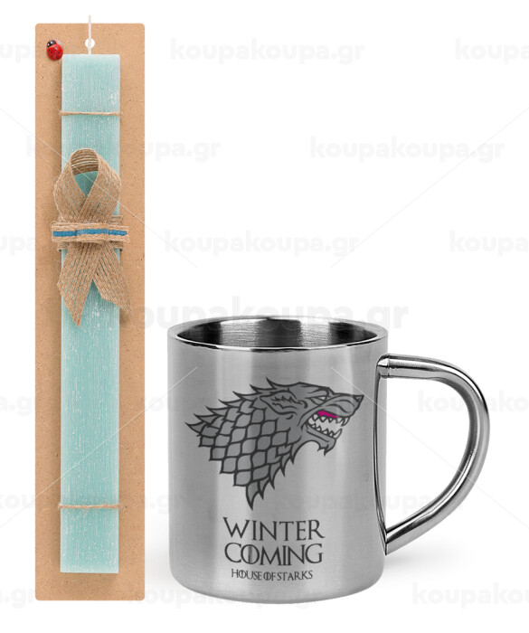 GOT House of Starks, winter coming, Πασχαλινή Λαμπάδα με μεταλλική κούπα θερμό (300ml) & κερί αρωματικό πλακέ (30cm) (ΤΙΡΚΟΥΑΖ)