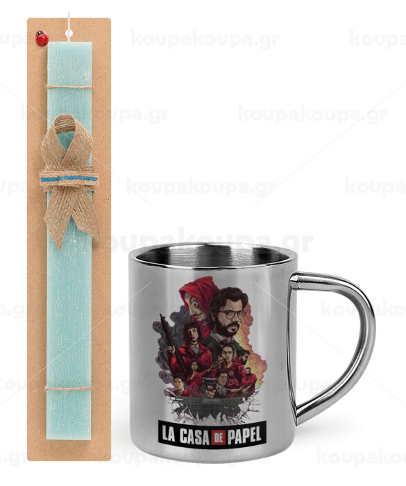 La casa de papel drawing cover, Πασχαλινή Λαμπάδα με μεταλλική κούπα θερμό (300ml) & κερί αρωματικό πλακέ (30cm) (ΤΙΡΚΟΥΑΖ)