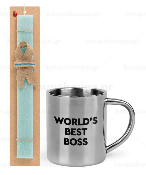 World's best boss, Πασχαλινή Λαμπάδα με μεταλλική κούπα θερμό (300ml) & κερί αρωματικό πλακέ (30cm) (ΤΙΡΚΟΥΑΖ)