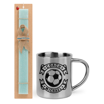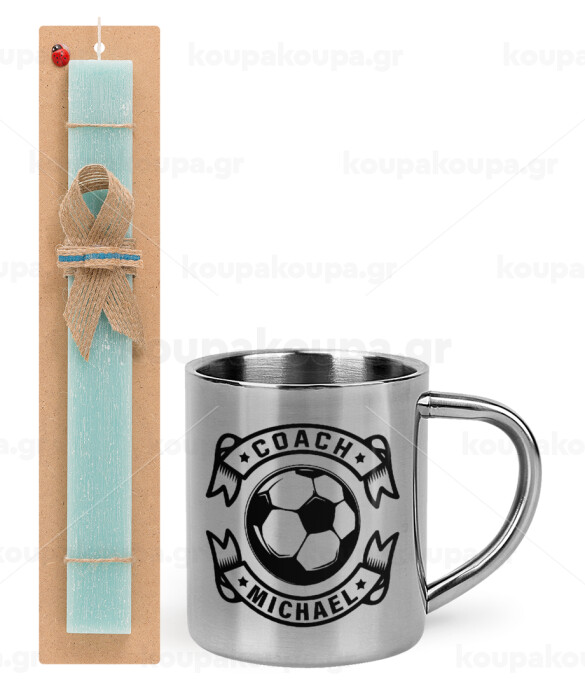 Soccer coach, Πασχαλινή Λαμπάδα με μεταλλική κούπα θερμό (300ml) & κερί αρωματικό πλακέ (30cm) (ΤΙΡΚΟΥΑΖ)