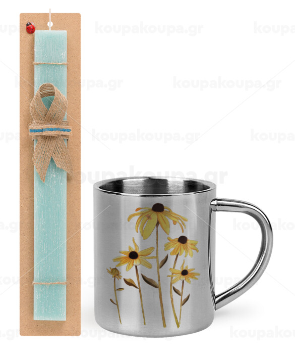 Daisies flower, Πασχαλινή Λαμπάδα με μεταλλική κούπα θερμό (300ml) & κερί αρωματικό πλακέ (30cm) (ΤΙΡΚΟΥΑΖ)