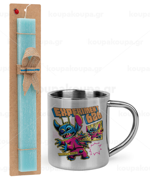 Stitch Experiment 626, Πασχαλινή Λαμπάδα με μεταλλική κούπα θερμό (300ml) & κερί αρωματικό πλακέ (30cm) (ΤΙΡΚΟΥΑΖ)