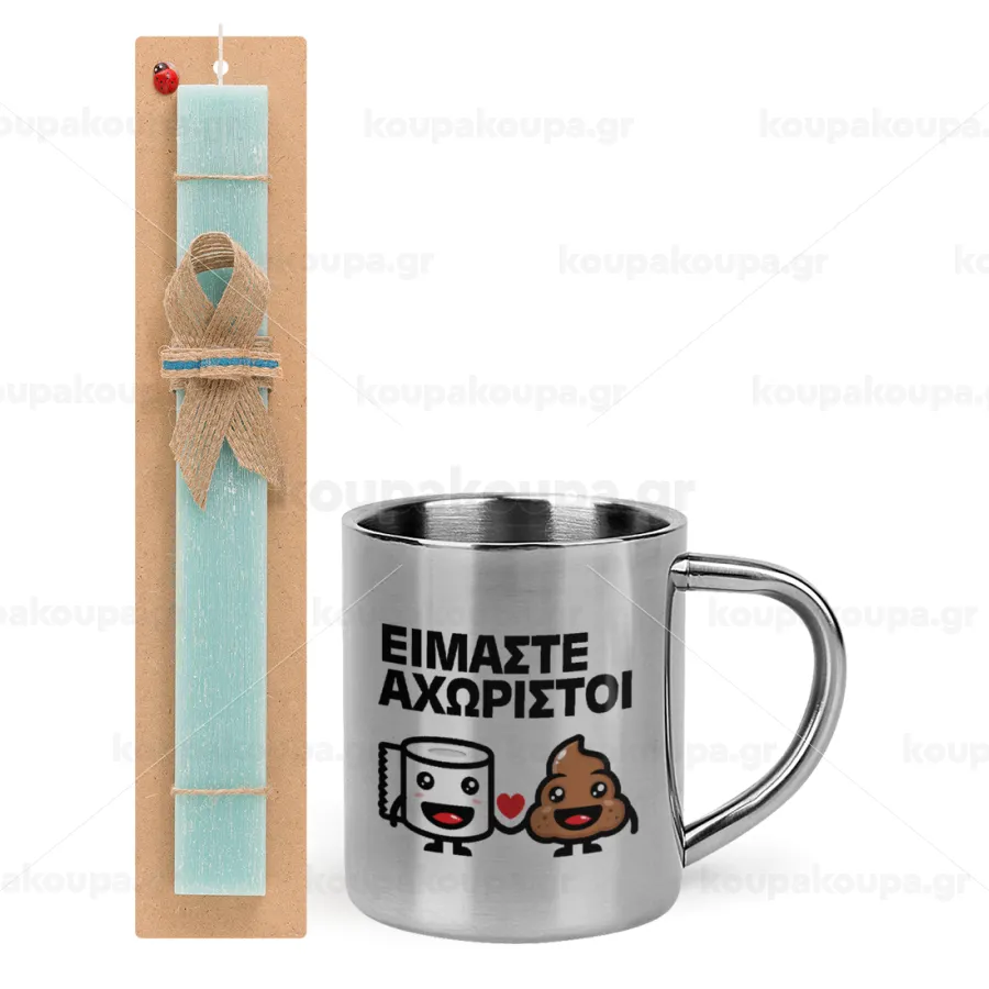 Είμαστε αχώριστοι, Πασχαλινή Λαμπάδα με μεταλλική κούπα θερμό (300ml) & κερί αρωματικό πλακέ (30cm) (ΤΙΡΚΟΥΑΖ)