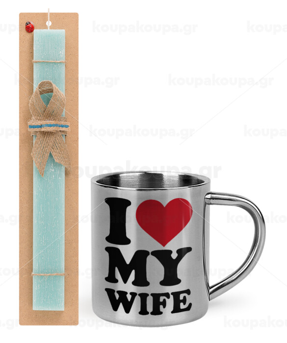I Love my Wife, Πασχαλινή Λαμπάδα με μεταλλική κούπα θερμό (300ml) & κερί αρωματικό πλακέ (30cm) (ΤΙΡΚΟΥΑΖ)