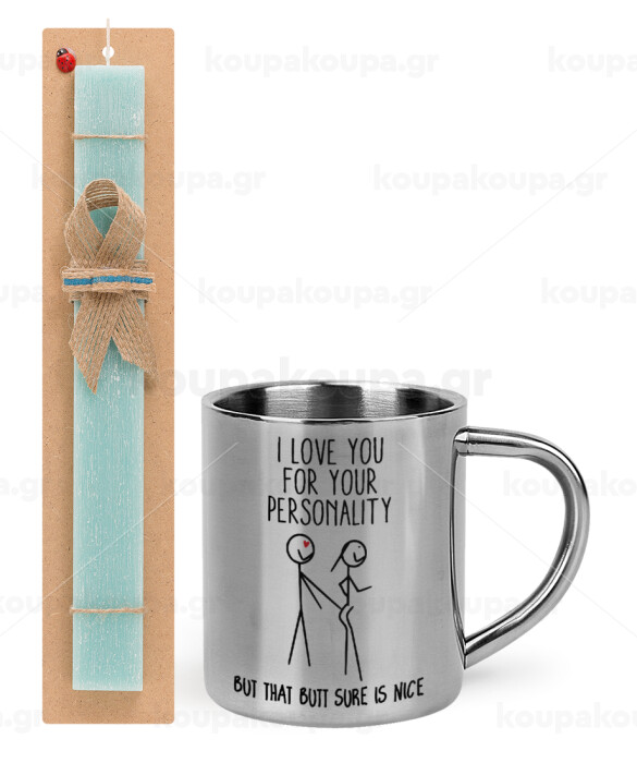 I Love you for your personality, Πασχαλινή Λαμπάδα με μεταλλική κούπα θερμό (300ml) & κερί αρωματικό πλακέ (30cm) (ΤΙΡΚΟΥΑΖ)
