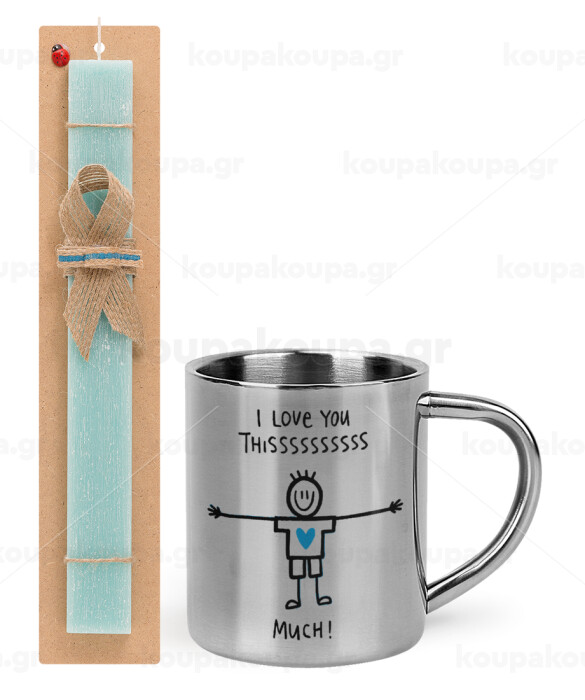 I Love you thissss much (boy)..., Πασχαλινή Λαμπάδα με μεταλλική κούπα θερμό (300ml) & κερί αρωματικό πλακέ (30cm) (ΤΙΡΚΟΥΑΖ)