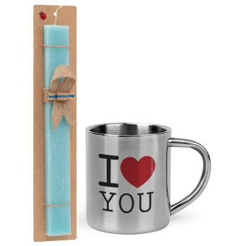 I Love you classic, Πασχαλινή Λαμπάδα με μεταλλική κούπα θερμό (300ml) & κερί αρωματικό πλακέ (30cm) (ΤΙΡΚΟΥΑΖ)