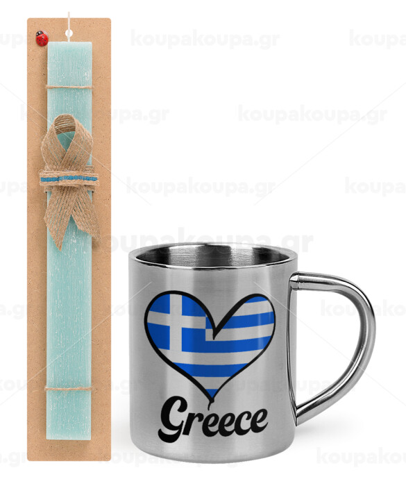 Greece flag, Πασχαλινή Λαμπάδα με μεταλλική κούπα θερμό (300ml) & κερί αρωματικό πλακέ (30cm) (ΤΙΡΚΟΥΑΖ)