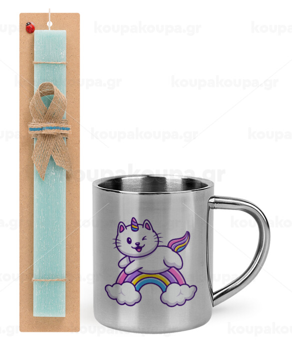 Cute cat unicorn, Πασχαλινή Λαμπάδα με μεταλλική κούπα θερμό (300ml) & κερί αρωματικό πλακέ (30cm) (ΤΙΡΚΟΥΑΖ)