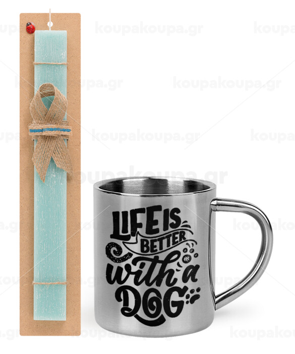 Life is better with a DOG, Πασχαλινή Λαμπάδα με μεταλλική κούπα θερμό (300ml) & κερί αρωματικό πλακέ (30cm) (ΤΙΡΚΟΥΑΖ)