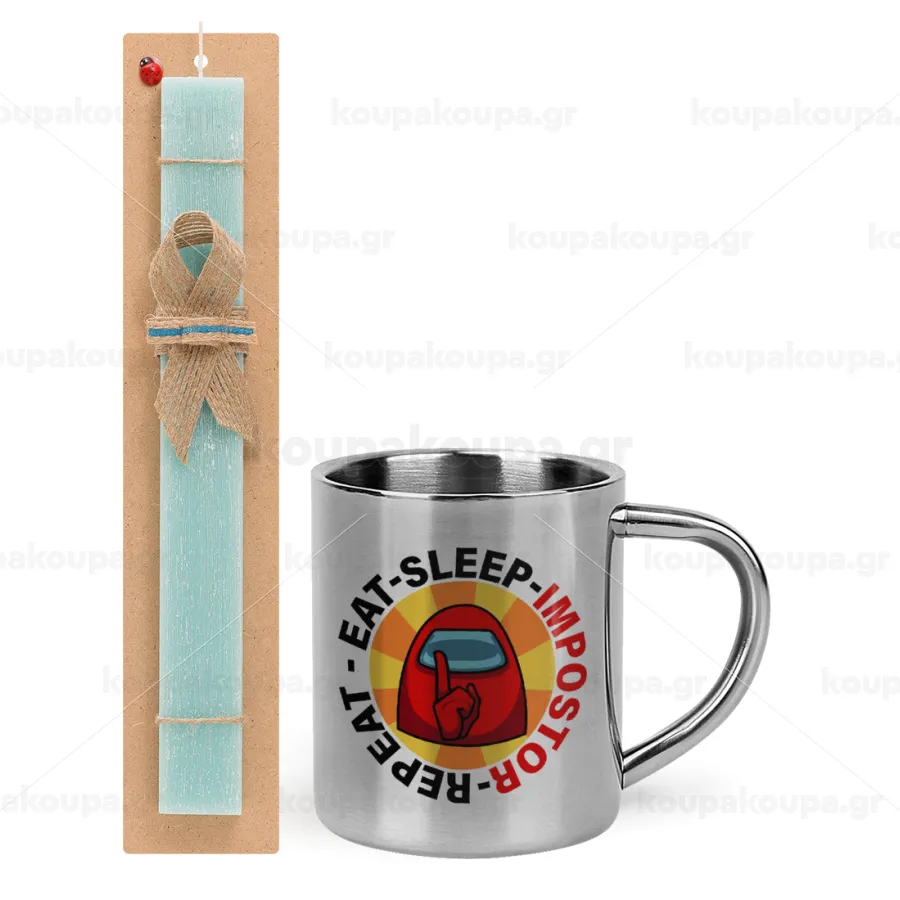 Among US Eat Sleep Repeat Impostor, Πασχαλινή Λαμπάδα με μεταλλική κούπα θερμό (300ml) & κερί αρωματικό πλακέ (30cm) (ΤΙΡΚΟΥΑΖ)