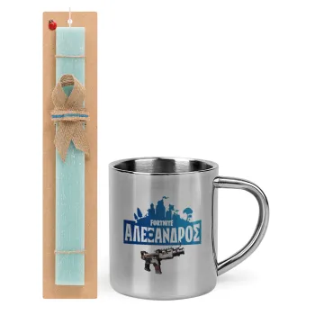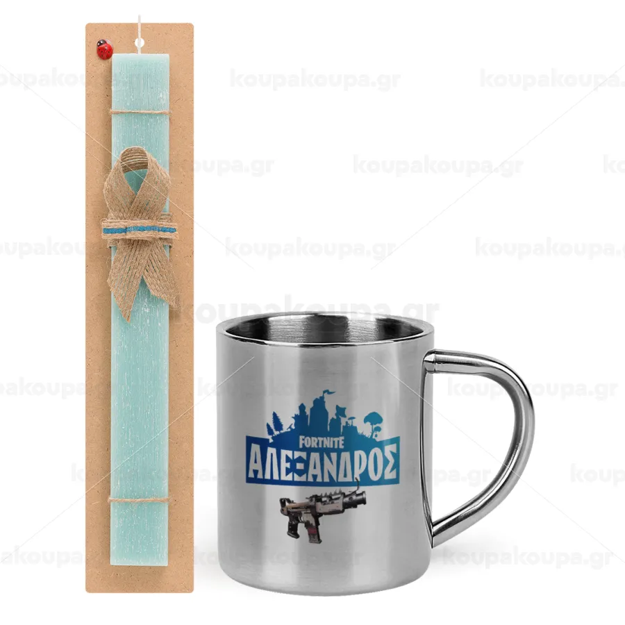 Fortnite with gun με το όνομα σου, Πασχαλινή Λαμπάδα με μεταλλική κούπα θερμό (300ml) & κερί αρωματικό πλακέ (30cm) (ΤΙΡΚΟΥΑΖ)