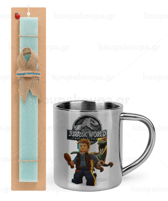 Jurassic world, Πασχαλινή Λαμπάδα με μεταλλική κούπα θερμό (300ml) & κερί αρωματικό πλακέ (30cm) (ΤΙΡΚΟΥΑΖ)