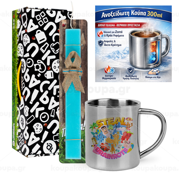Roblox Steal a Brainrot, Πασχαλινή Λαμπάδα με μεταλλική κούπα θερμό (300ml) & κερί αρωματικό πλακέ (30cm) (ΤΙΡΚΟΥΑΖ)