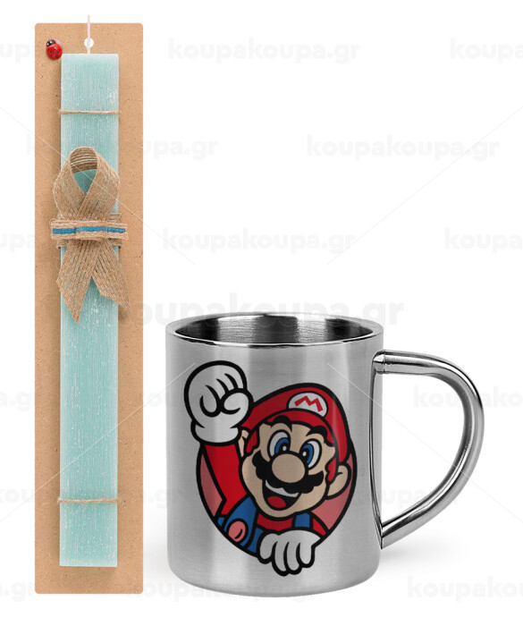Super mario win, Πασχαλινή Λαμπάδα με μεταλλική κούπα θερμό (300ml) & κερί αρωματικό πλακέ (30cm) (ΤΙΡΚΟΥΑΖ)