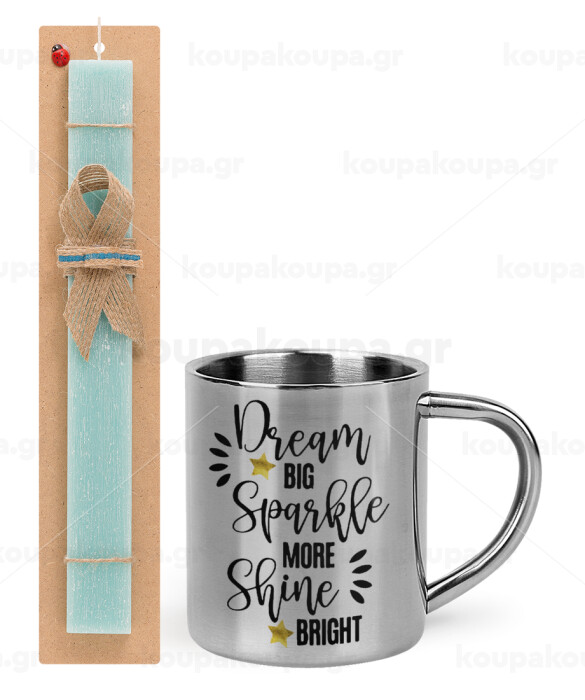 Dream big, Sparkle more, Shine bright, Πασχαλινή Λαμπάδα με μεταλλική κούπα θερμό (300ml) & κερί αρωματικό πλακέ (30cm) (ΤΙΡΚΟΥΑΖ)