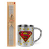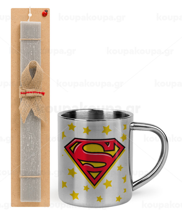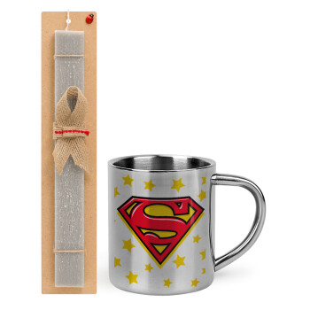 Superman Blue, Πασχαλινή Λαμπάδα με μεταλλική κούπα θερμό (300ml) & κερί αρωματικό πλακέ (30cm) (ΓΚΡΙ)