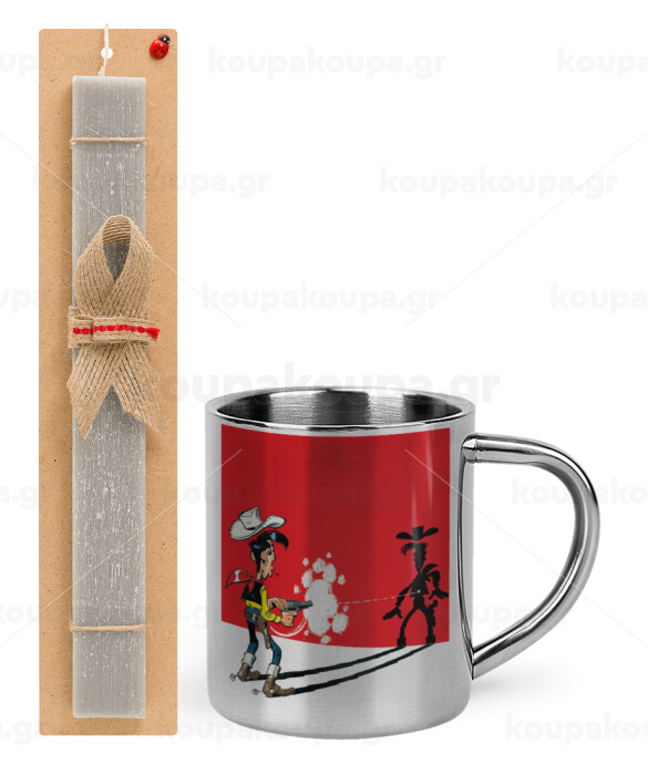 Λούκυ Λουκ σκιές, Πασχαλινή Λαμπάδα με μεταλλική κούπα θερμό (300ml) & κερί αρωματικό πλακέ (30cm) (ΓΚΡΙ)