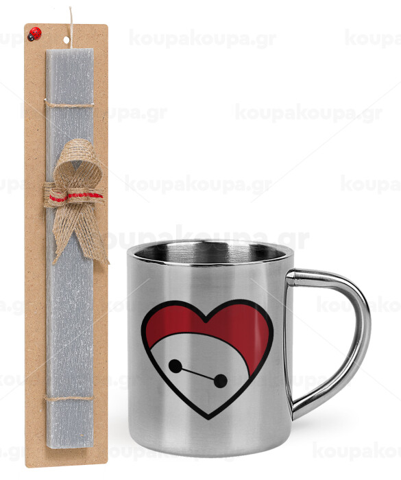 Baymax heart, Πασχαλινή Λαμπάδα με μεταλλική κούπα θερμό (300ml) & κερί αρωματικό πλακέ (30cm) (ΓΚΡΙ)