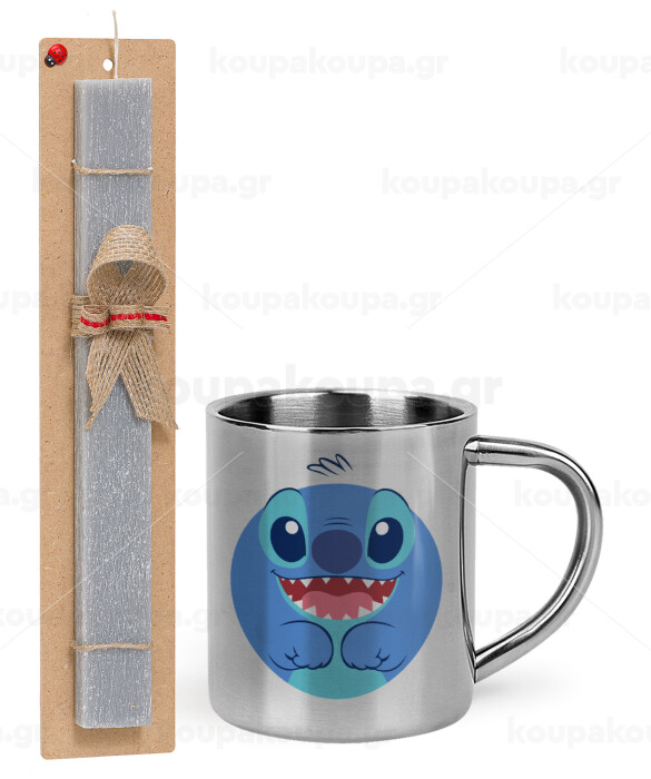 Lilo & Stitch blue, Πασχαλινή Λαμπάδα με μεταλλική κούπα θερμό (300ml) & κερί αρωματικό πλακέ (30cm) (ΓΚΡΙ)