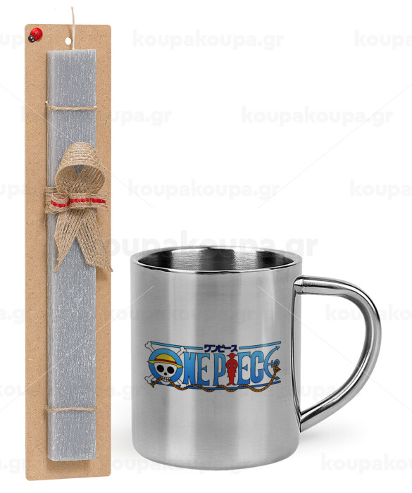 Onepiece logo, Πασχαλινή Λαμπάδα με μεταλλική κούπα θερμό (300ml) & κερί αρωματικό πλακέ (30cm) (ΓΚΡΙ)
