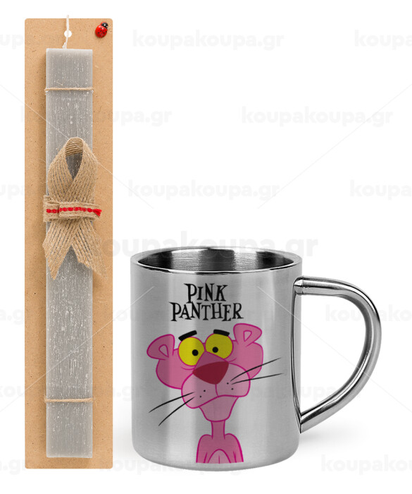 Pink Panther cartoon, Πασχαλινή Λαμπάδα με μεταλλική κούπα θερμό (300ml) & κερί αρωματικό πλακέ (30cm) (ΓΚΡΙ)