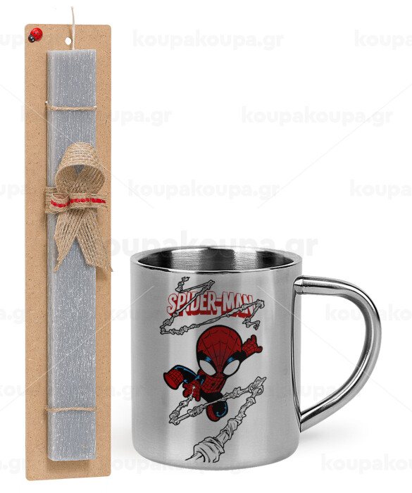 Spiderman kid, Πασχαλινή Λαμπάδα με μεταλλική κούπα θερμό (300ml) & κερί αρωματικό πλακέ (30cm) (ΓΚΡΙ)