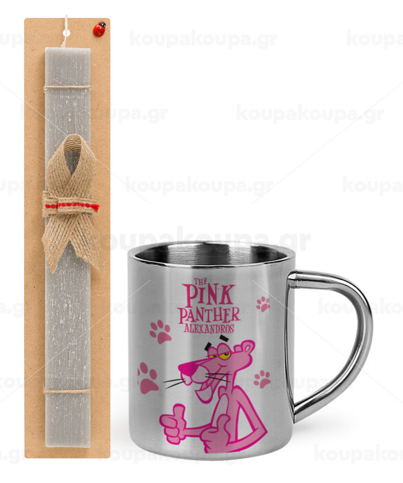 The pink panther, Πασχαλινή Λαμπάδα με μεταλλική κούπα θερμό (300ml) & κερί αρωματικό πλακέ (30cm) (ΓΚΡΙ)