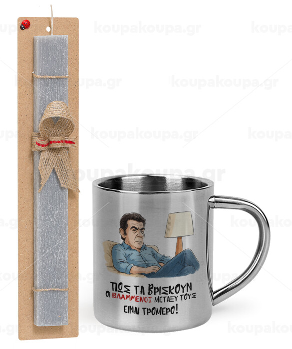 ΠΩΣ ΤΑ ΒΡΙΣΚΟΥΝ ΟΙ ΒΛΑ....ΝΟΙ ΜΕΤΑΞΥ ΤΟΥΣ, ΕΙΝΑΙ ΤΡΟΜΕΡΟ!!!, Πασχαλινή Λαμπάδα με μεταλλική κούπα θερμό (300ml) & κερί αρωματικό πλακέ (30cm) (ΓΚΡΙ)