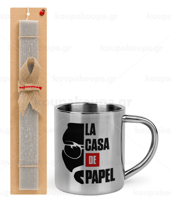 La casa de papel, Πασχαλινή Λαμπάδα με μεταλλική κούπα θερμό (300ml) & κερί αρωματικό πλακέ (30cm) (ΓΚΡΙ)