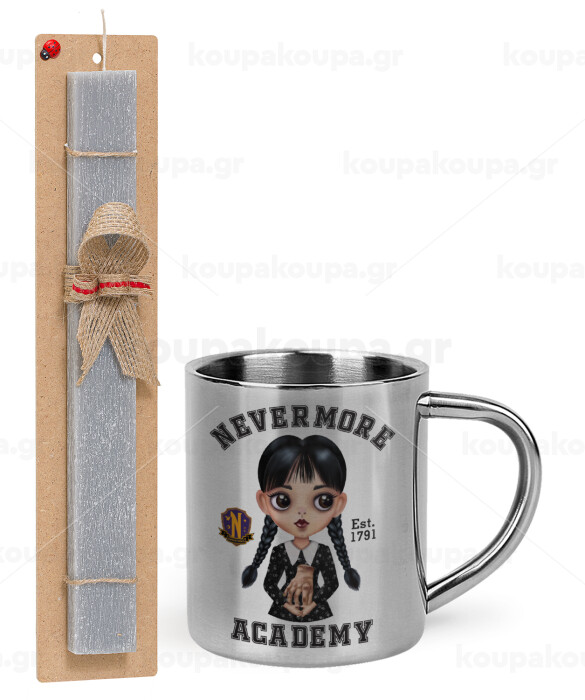 Wednesday Adams, nevermore, Πασχαλινή Λαμπάδα με μεταλλική κούπα θερμό (300ml) & κερί αρωματικό πλακέ (30cm) (ΓΚΡΙ)