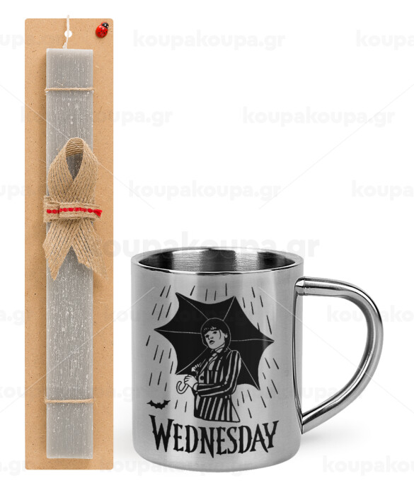 Wednesday Addams, Πασχαλινή Λαμπάδα με μεταλλική κούπα θερμό (300ml) & κερί αρωματικό πλακέ (30cm) (ΓΚΡΙ)