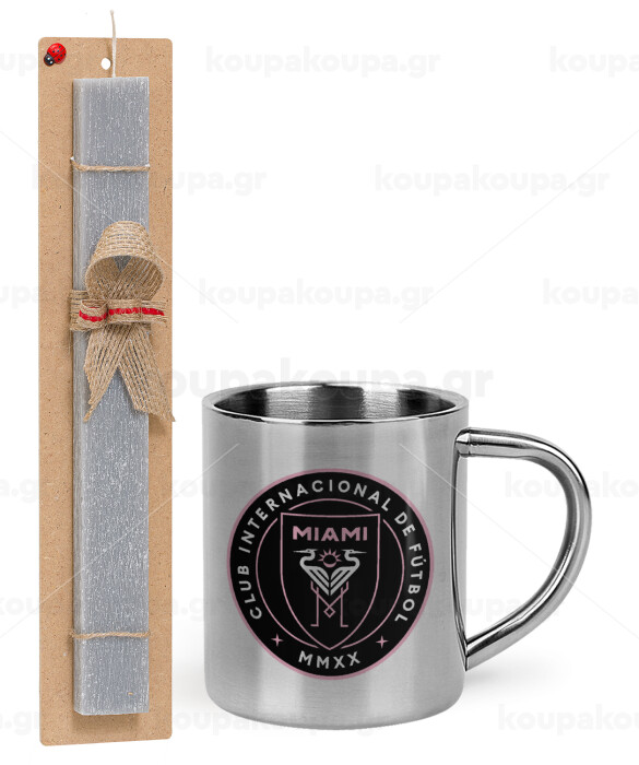 Ίντερ Μαϊάμι (Inter Miami CF), Πασχαλινή Λαμπάδα με μεταλλική κούπα θερμό (300ml) & κερί αρωματικό πλακέ (30cm) (ΓΚΡΙ)