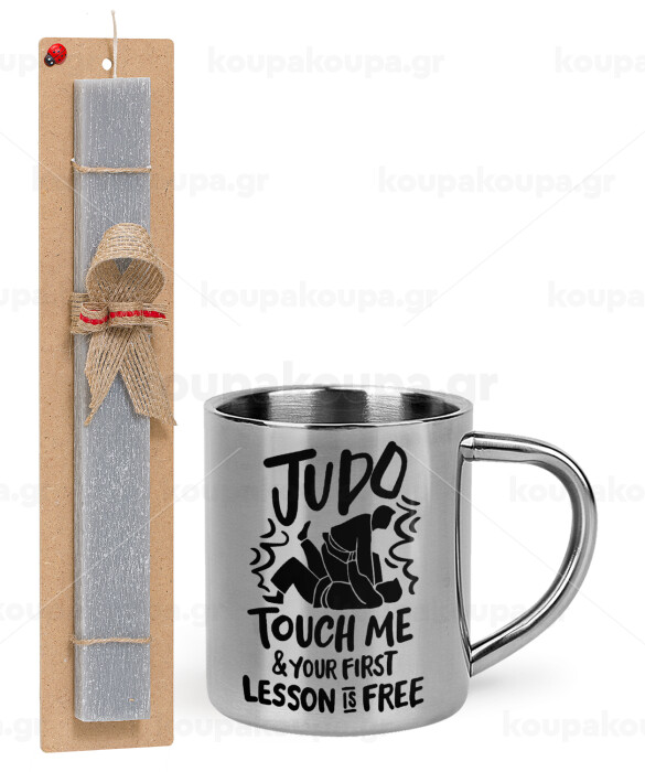 Judo Touch Me And Your First Lesson Is Free, Πασχαλινή Λαμπάδα με μεταλλική κούπα θερμό (300ml) & κερί αρωματικό πλακέ (30cm) (ΓΚΡΙ)