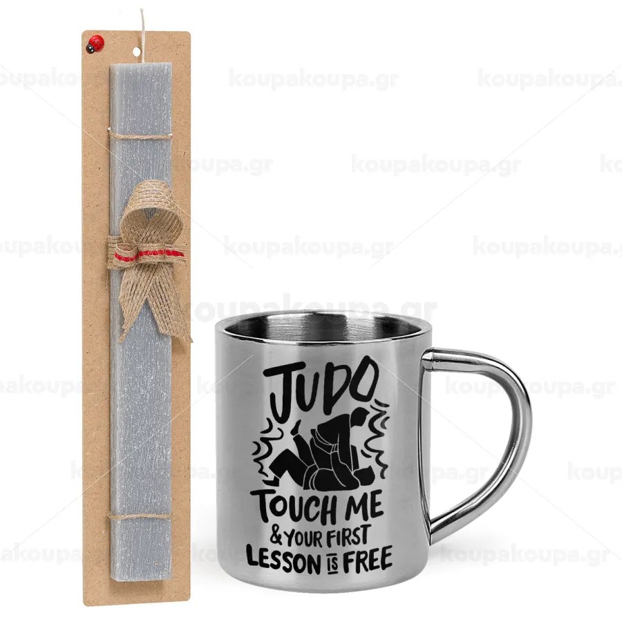 Judo Touch Me And Your First Lesson Is Free, Πασχαλινή Λαμπάδα με μεταλλική κούπα θερμό (300ml) & κερί αρωματικό πλακέ (30cm) (ΓΚΡΙ)