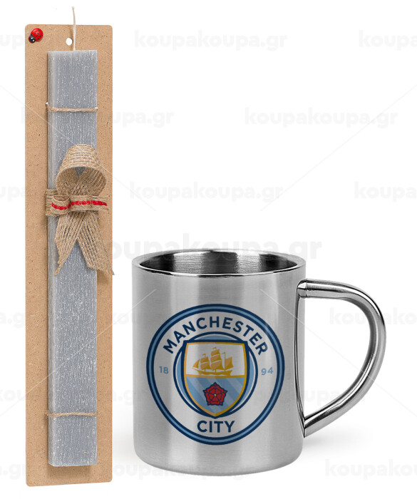 Manchester City FC , Πασχαλινή Λαμπάδα με μεταλλική κούπα θερμό (300ml) & κερί αρωματικό πλακέ (30cm) (ΓΚΡΙ)