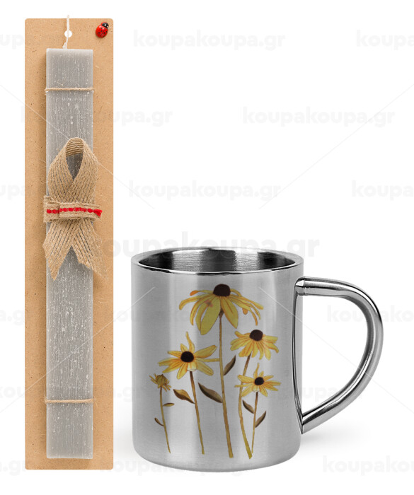 Daisies flower, Πασχαλινή Λαμπάδα με μεταλλική κούπα θερμό (300ml) & κερί αρωματικό πλακέ (30cm) (ΓΚΡΙ)