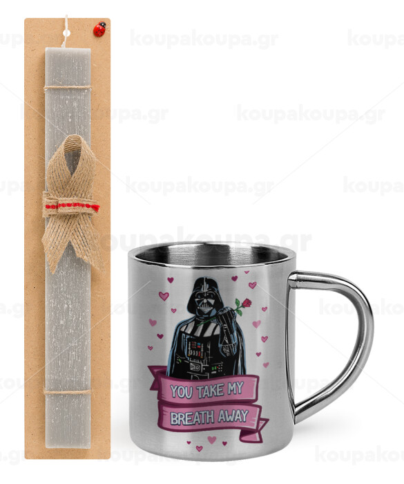 Darth Vader, you take my breath away, Πασχαλινή Λαμπάδα με μεταλλική κούπα θερμό (300ml) & κερί αρωματικό πλακέ (30cm) (ΓΚΡΙ)