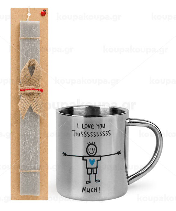 I Love you thissss much (boy)..., Πασχαλινή Λαμπάδα με μεταλλική κούπα θερμό (300ml) & κερί αρωματικό πλακέ (30cm) (ΓΚΡΙ)