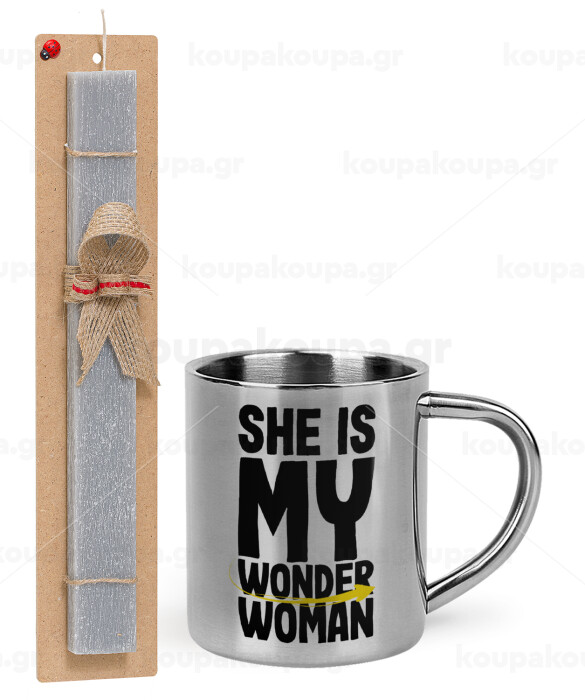 She is my wonder woman, Πασχαλινή Λαμπάδα με μεταλλική κούπα θερμό (300ml) & κερί αρωματικό πλακέ (30cm) (ΓΚΡΙ)