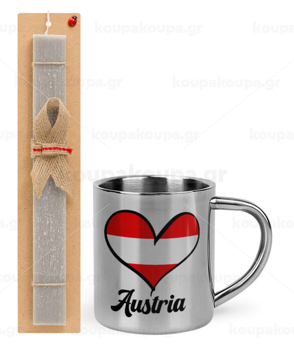 Austria flag, Πασχαλινή Λαμπάδα με μεταλλική κούπα θερμό (300ml) & κερί αρωματικό πλακέ (30cm) (ΓΚΡΙ)
