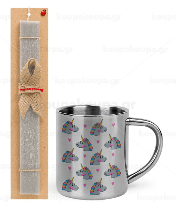 Unicorn, Πασχαλινή Λαμπάδα με μεταλλική κούπα θερμό (300ml) & κερί αρωματικό πλακέ (30cm) (ΓΚΡΙ)