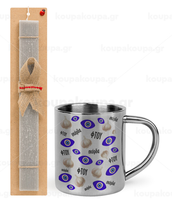 Φτου, φτου, σκόρδα!!!, Πασχαλινή Λαμπάδα με μεταλλική κούπα θερμό (300ml) & κερί αρωματικό πλακέ (30cm) (ΓΚΡΙ)