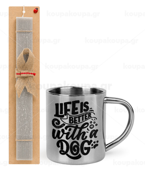Life is better with a DOG, Πασχαλινή Λαμπάδα με μεταλλική κούπα θερμό (300ml) & κερί αρωματικό πλακέ (30cm) (ΓΚΡΙ)