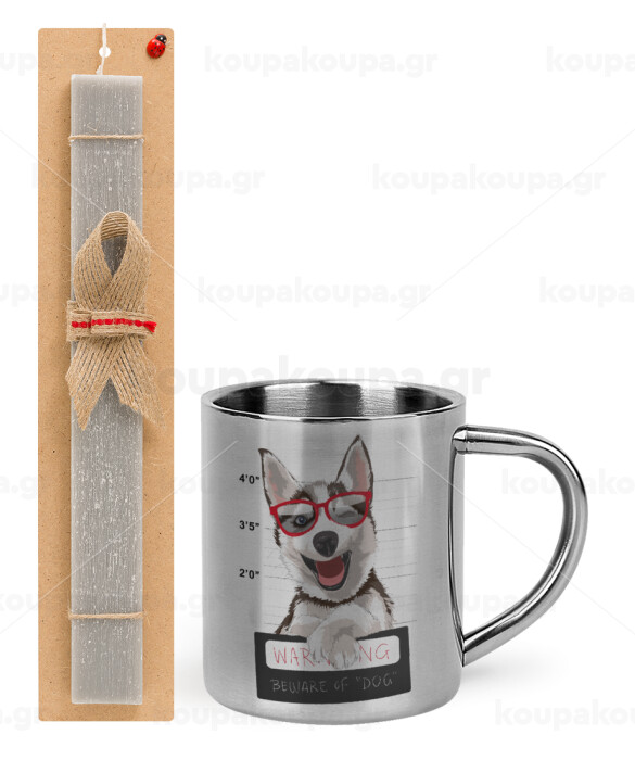 Warning, beware of Dog, Πασχαλινή Λαμπάδα με μεταλλική κούπα θερμό (300ml) & κερί αρωματικό πλακέ (30cm) (ΓΚΡΙ)